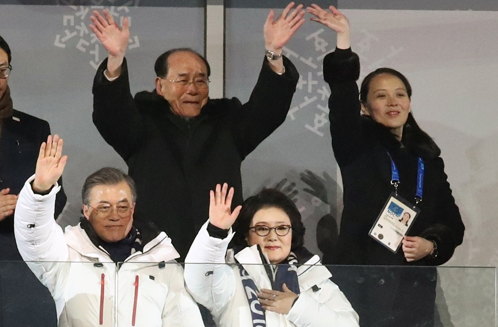 평창겨울올림픽 개막식에서 문재인 대통령과 북한 김영남 최고인민회의 상임위원장, 김여정 북한 노동당 중앙위 제1부부장이 단일팀을 향해 손을 흔들고 있다.