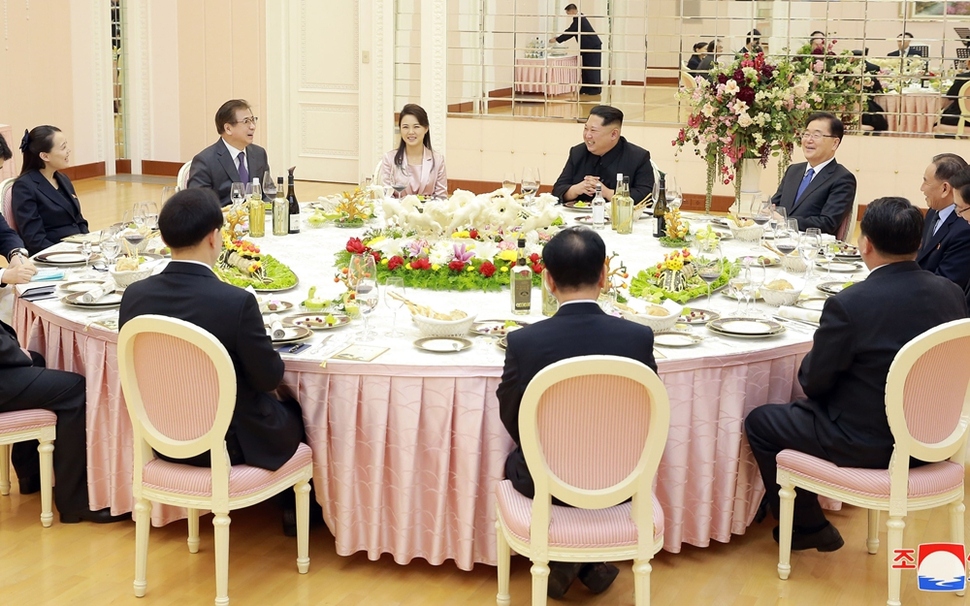 북한을 방문 중인 정의용 대북특사 등 특사단이 3월5일 평양 조선노동당 청사에서 열린 만찬에서 김정은 북한조선노동당 위원장 등과 환담하고 있다. 이날 만찬에는 김 위원장의 부인 리설주, 김영철 노동당 부위원장, 김여정 노동당 중앙위 제1부부장 등이 배석했다. 평양 조선중앙통신 연합뉴스