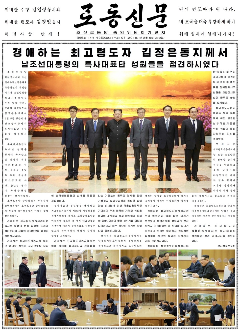 노동당 기관지 <노동신문>이 3월6일치 1면에 김정은 위원장과 문재인 대통령 대북특별사절대표단이 전날 진행한 면담 사진과 기사를 실었다. 김정은 위원장과 대북특사단이 찍은 기념사진이 1면 중앙에 배치돼 있다. 연합뉴스