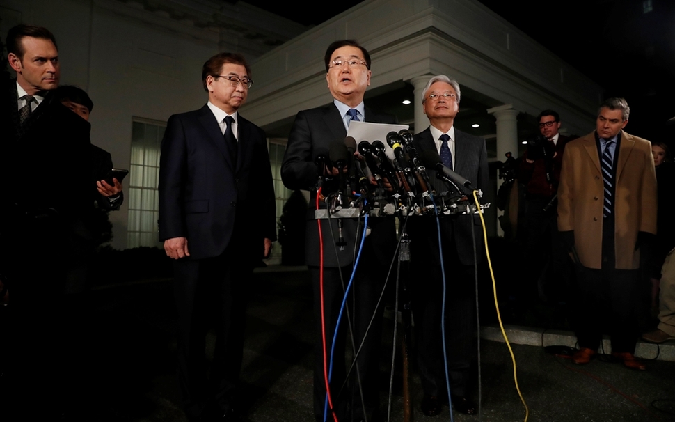 정의용 청와대 국가안보실장이 3월8일(현지시각) 오후 미국 워싱턴 백악관 웨스트윙 앞에서 도널드 트럼프 미국 대통령과 진행한 면담 결과를 발표하고 있다. 왼쪽은 서훈 국가정보원장. 오른쪽은 조윤제 주미대사다. 로이터 연합뉴스