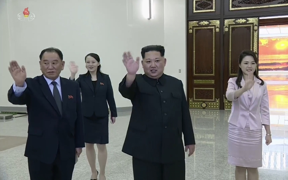 북한 <조선중앙TV>는 3월6일 오후 김정은 위원장이 대북특별사절단과 면담·만찬하고 있는 약 10분 분량의 영상을 공개했다. 만찬이 끝난 뒤 김정은 위원장이 북쪽이 마련한 차량에 탑승한 특사단을 배웅하고 있다. 왼쪽부터 김영철 노동당 중앙위원회 부위원장 겸 통일전선부장, 김여정 제1부부장, 김정은 위원장, 리설주. 연합뉴스