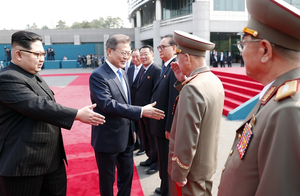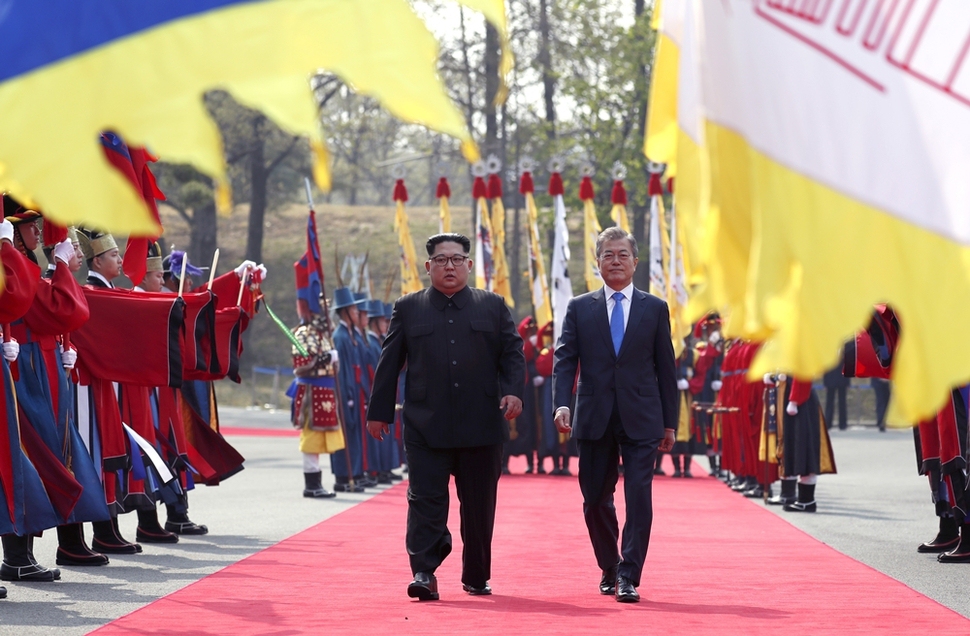 문재인 대통령과 김정은 북한 국무위원장이 4월27일 오전 전통의장대가 도열한 판문점 남쪽 지역에서 평화의집으로 함께 걸어가고 있다.