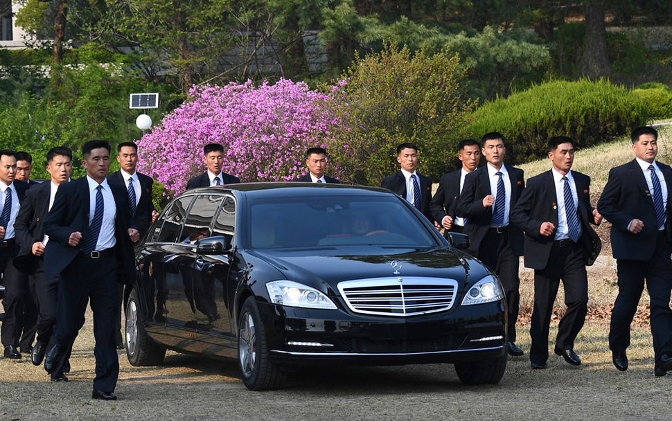 정상회담을 마친 김정은 국무위원장이 군사분계선을 넘어 판문점 북쪽 지역으로 갔다가 이날 오후 평화의집으로 돌아오는 동안 북쪽 경호원들이 김 위원장의 차를 에워싼 채 달리고 있다.