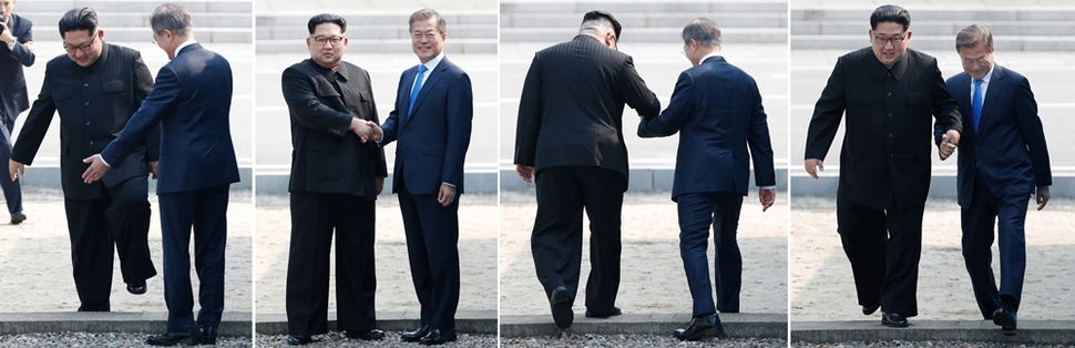 문재인 대통령과 김정은 국무위원장이 판문점 군사분계선에서 만나 인사한 뒤, 김 위원장의 요청으로 함께 북쪽으로 넘어갔다가 다시 남쪽으로 넘어오고 있다.