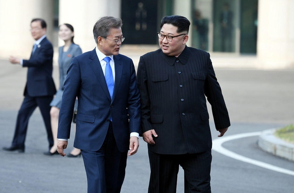 문재인 대통령과 김정은 국무위원장이 평화의집으로 향하며 이야기하고 있다. 뒤에서 정의용 국가안보실장과 김여정 북한 노동당 중앙위원회 제1부부장이 함께 걷고 있다.