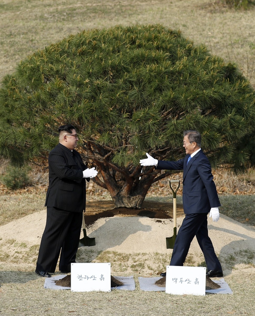 문재인 대통령과 김정은 국무위원장이 고 정주영 현대그룹 회장이 소떼를 몰고 방북했던 군사분계선 인근 ‘소떼 길’ 위에 1953년생 소나무를 심은 뒤 악수하기 위해 다가서고 있다.