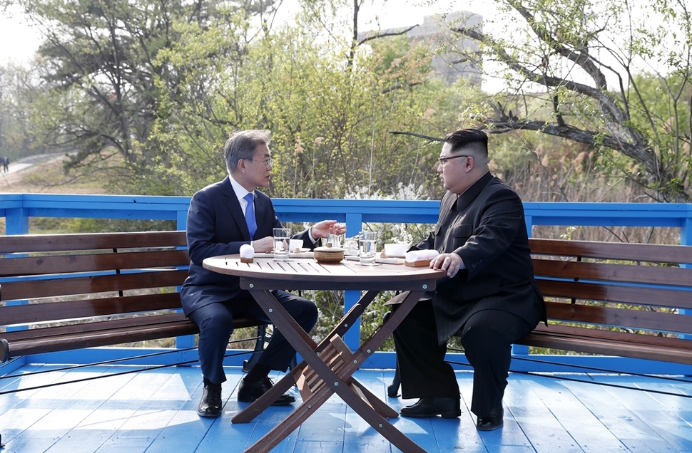 문재인 대통령과 김정은 국무위원장이 도보다리 위에 마련된 벤치에서 일대일로 이야기하고 있다.