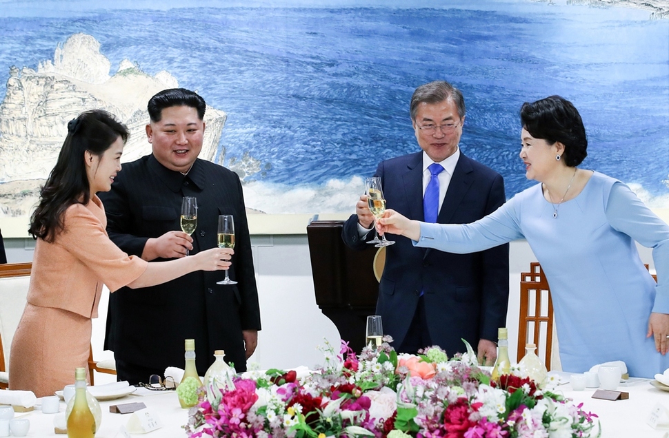 판문점 평화의집에서 열린 만찬에서 문재인 대통령과 부인 김정숙 여사, 김정은 국무위원장과 부인 리설주 여사가 건배하고 있다.