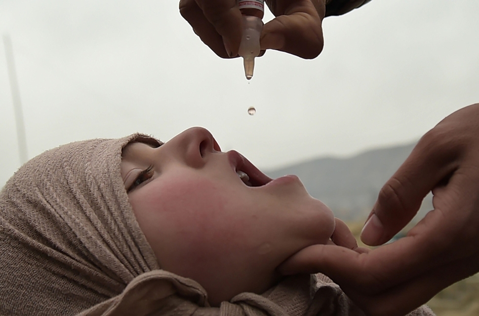 아프가니스탄 카불에서 2017년 2월28일 백신 캠페인에 참여한 의료인이 어린이에게 소아마비 백신을 입에 넣어주고 있다. 지난 4월30일 카불 테러 현장에서 기자를 가장한 테러범의 자폭테러로 숨진 《AFP》 통신 사진기자 샤 마라이가 찍었다.