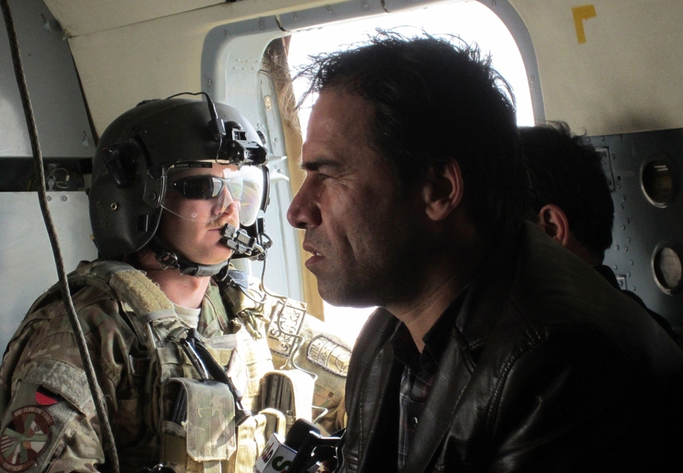 샤 마라이가 2013년 국제안보지원군 대원들과 함께 헬기에 올라 현장으로 가고 있다.