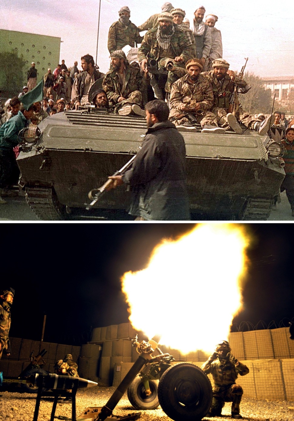 2001년 11월13일, 탈레반 정권이 무너지자 북부동맹그룹 보안군이 카불에 들어오고 있다(위)./ 프랑스 해병 포병연대가 2012년 3월12일 카불주 스로비 지역 군사기지에서 박격포 발사훈련을 하고 있다.