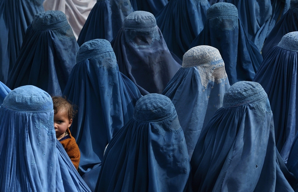 2014년 2월18일 잘랄라바드에서 압둘라 압둘라 아프가니스탄 대통령 후보가 유세를 하는 동안, 여성들 사이에서 한 아기가 주변을 살피고 있다.