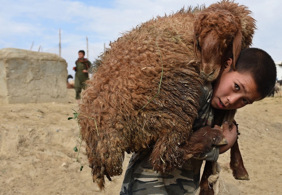 2015년 9월22일 이슬람 명절 ‘이드 알아드하’(희생제)를 앞두고 한 아프간 소년이 가축시장에서 양을 어깨에 멘 채 걸어가고 있다.
