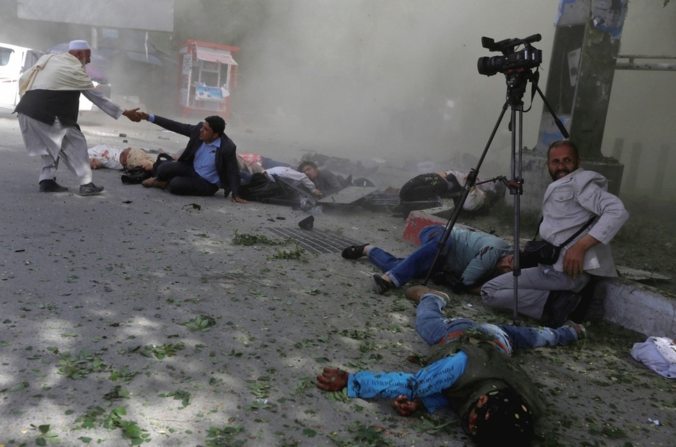 두 번째 자폭테러로 희생된 아프간 언론인들이 현장에 쓰러져 있다.