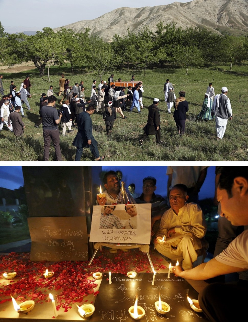 샤 마라이의 가족과 동료, 친구들이 그가 살았던 카불주 굴다라 마을에서 그의 주검이 담긴 관을 옮기고 있다(위)./ 5월1일 밤 파키스탄 이슬라마바드에서 파키스탄 언론인들이 샤 마라이를 추모하며 촛불과 등불을 밝히고 있다
