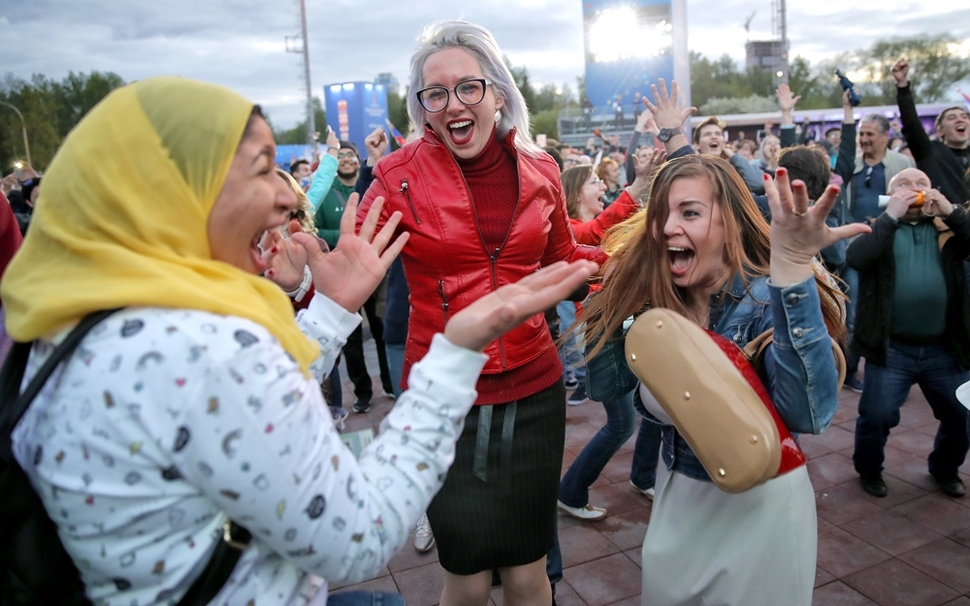 러시아 월드컵 거리응원에 나선 예카테린부르크 시민과 축구 팬들이 6월14일 저녁(현지시각) 모스크바에서 열린 개막 경기에서 러시아가 사우디아라비아를 상대로 골을 터뜨리자 열광하고 있다. 국제축구연맹(FIFA) 랭킹 70위인 러시아는 이날 67위인 사우디를 상대로 다섯 골을 터뜨리며 홈 팬들을 흥분에 빠뜨렸다. 16강 진출의 분수령이 될 스웨덴전 등 예선전을 앞두고 ‘대~~한민국’ 광장도 달아오르고 있다.