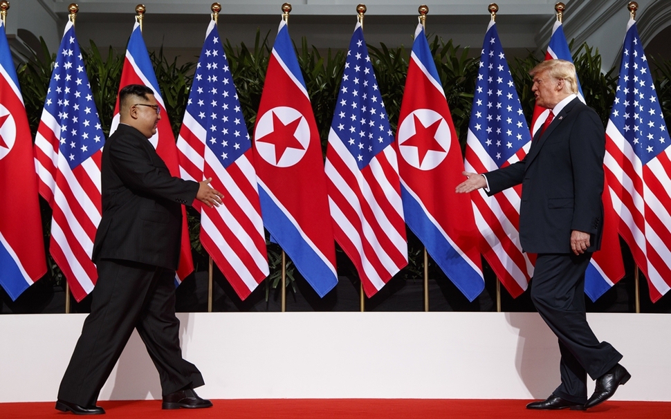 1950년 한국전쟁의 교전 당사국이자 정전협정 서명국이던 북한과 미국의 정상이 사상 처음 만났다. 김정은 북한 국무위원장(왼쪽)과 도널드 트럼프 미국 대통령이 지난 6월12일 오전 싱가포르 센토사섬 카펠라호텔에서 정상회담을 하기에 앞서 서로를 향해 손을 내민 채 다가서고 있다. 싱가포르=AP 연합뉴스