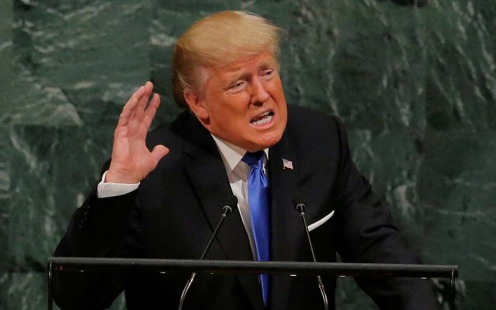 도널드 트럼프 미국 대통령이 2017년 9월 20일 유엔총회 연설에서 김정은 위원장을 ‘리틀 로켓맨’이라 부르며, “미국과 동맹을 방어해야 한다면 우리는 북한을 완전히 파괴하는 것 외에 다른 선택이 없을 것”이라고 말하고 있다.