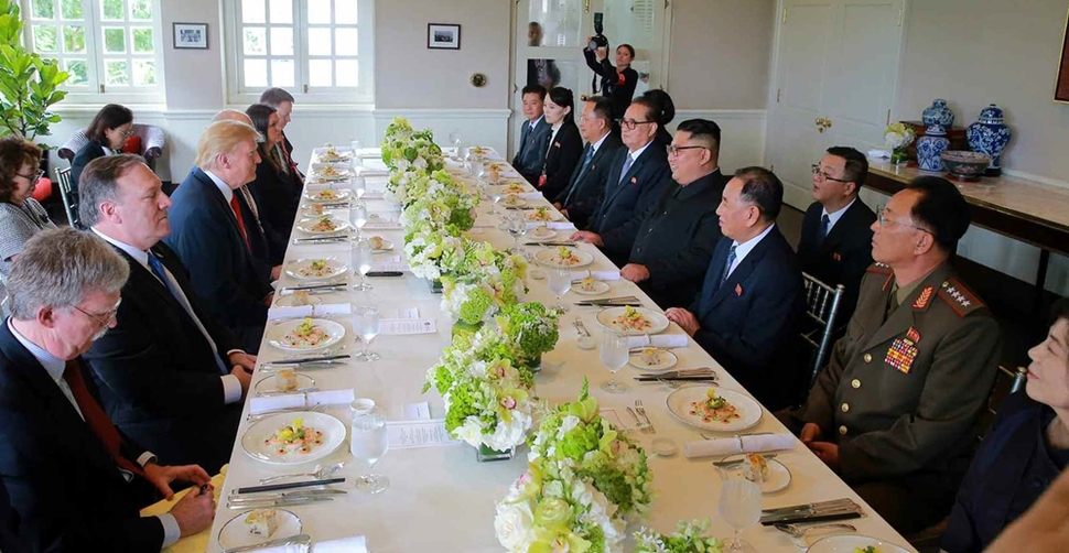 북-미 정상과 대표단이 6월12일 낮 카펠라 호텔에서 업무오찬을 함께하고 있다. 오이선과 대구조림 등 한국 음식과 프랑스 요리인 소갈비 콩피 등 동서양의 조화를 이룬 코스 요리가 나왔다. 오이선은 오이에 칼집을 내 고기와 달걀·당근 등을 끼워넣은 여름 음식이다.