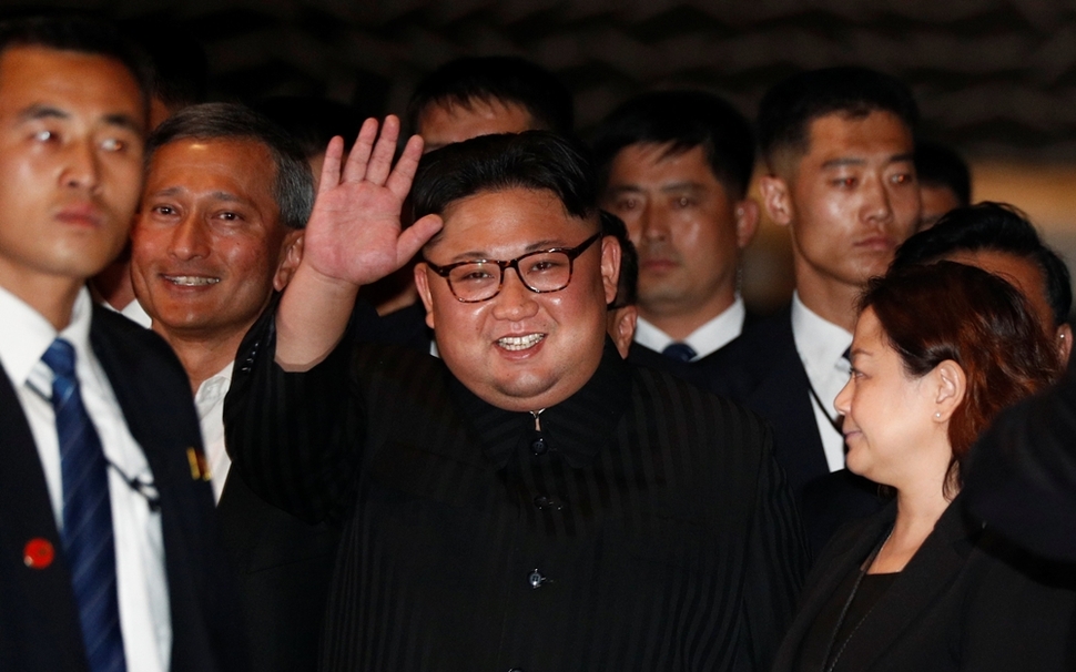 트럼프 미국 대통령과 정상회담을 하려고 2018년 6월10일 싱가포르에 도착한 김정은 북한 국무위원장이 11일 밤 마리나베이샌즈호텔을 둘러보다 환호하는 시민들을 향해 손을 흔들고 있다.