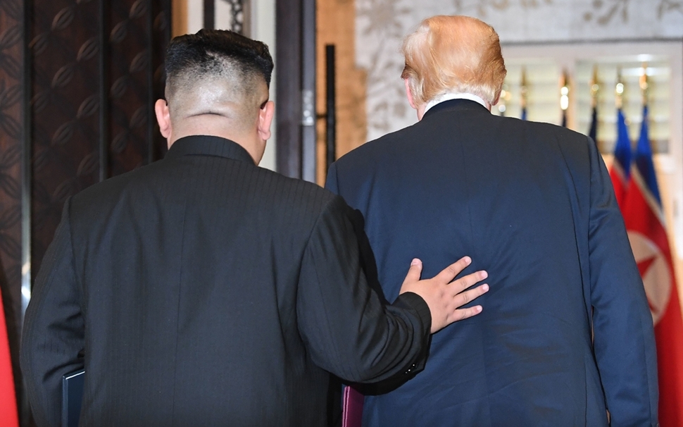 김정은 북한 국무위원장이 6월12일 오후 카펠라호텔에서 도널드 트럼프 미국 대통령과 공동성명서에 서명한 뒤 행사장을 나가며 트럼프 대통령의 등에 손을 얹고 있다.
