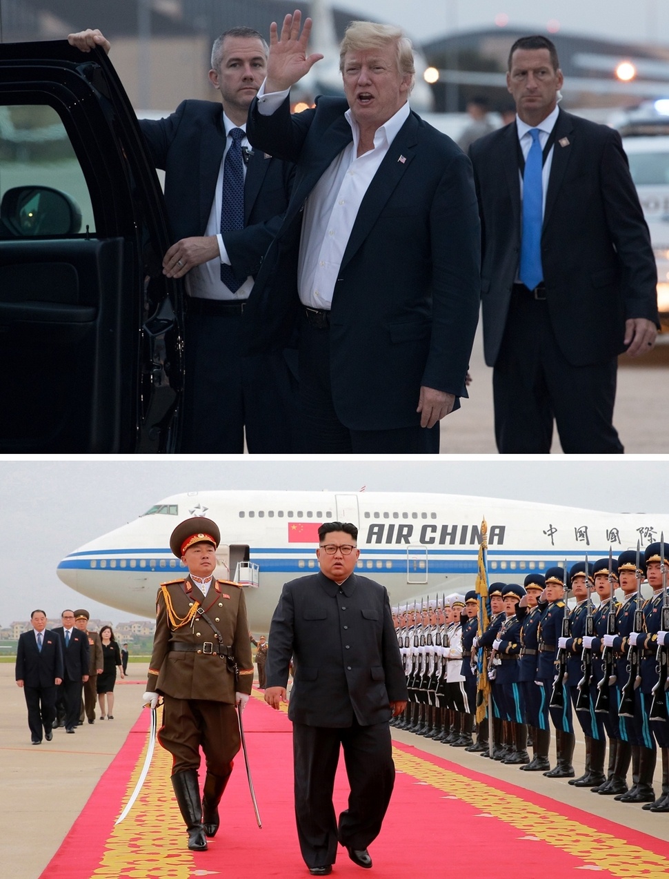 도널드 트럼프 미국 대통령이 북-미 정상회담을 마치고 6월13일 워싱턴 인근 앤드루 공군기지에 도착해 백악관으로 가는 차에 오르며 보도진을 향해 손을 흔들고 있다.(위)/ 김정은 북한 국무위원장이 북-미 정상회담을 마치고 6월13일 평양 순안공항에 도착해 의장대의 사열을 받고 있다. 뒤편에 김 위원장이 타고 온 중국 민항기가 보인다.