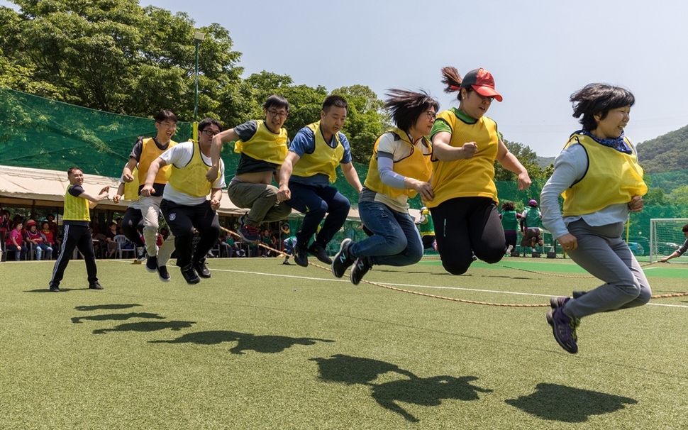 금속노조 삼성전자서비스 서울지회 조합원들이 5월26일 경기도 양주시 장흥면에서 열린 금속노조 서울지부 체육대회에 참가해 단체줄넘기를 하고 있다.