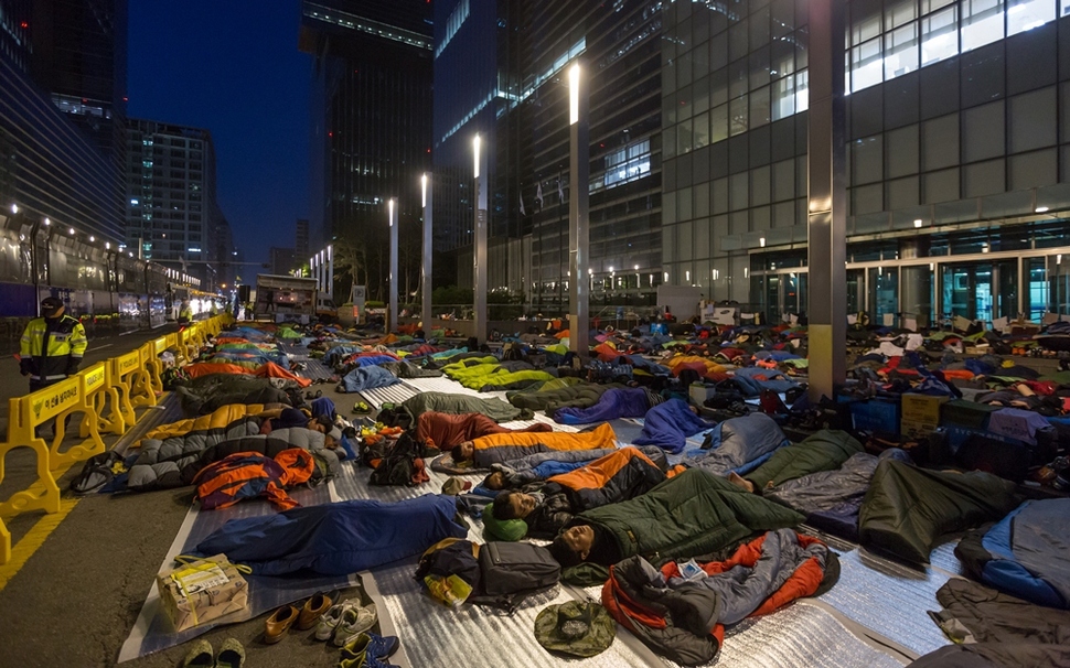 2014년 5월 삼성전자서비스 노동자들이 서울 서초동 삼성 본사 앞에서 노동조합 인정과 직접 대화를 요구하며 41일간 노숙농성을 벌이고 있다.