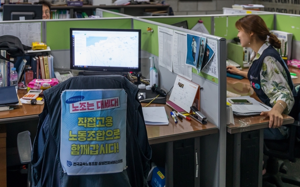 요즘 금속노조 삼성전자서비스지회 집행부는 조끼에 “노조는 대세다”라는 문장을 써붙이고 다닌다. 삼성전자서비스지회는 지난 4월 삼성전자서비스 회사 쪽과 직접고용, 노동조합 인정·활동 보장에 합의했다. 그 뒤 직접고용과 임금, 복지 등 처우 기준을 논의하는 실무 협의가 매주 두 차례 이뤄진다.