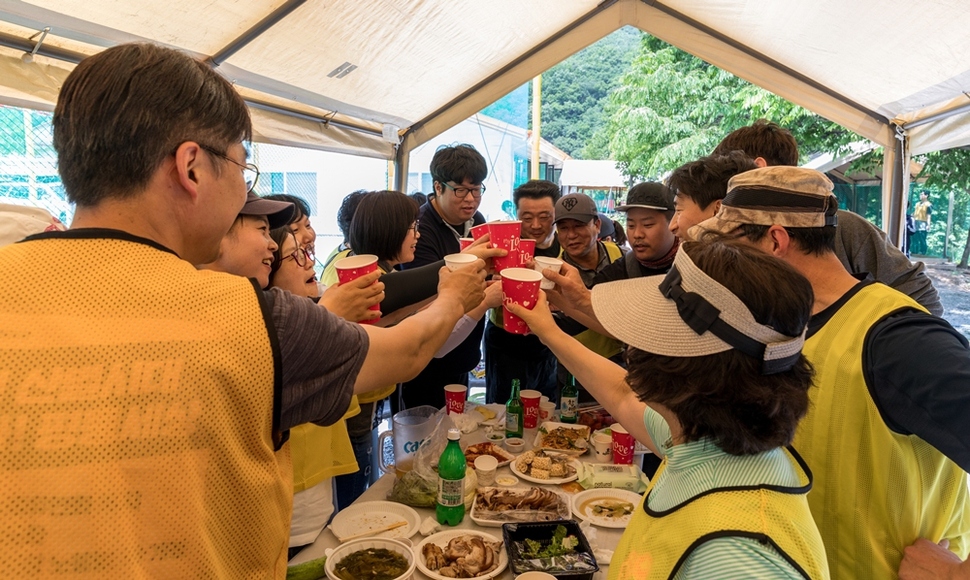 금속노조 서울지부 체육대회에 참가한 삼성전자서비스 조합원들이 금속노조 산하 쟁의 사업장인 레이테크노조의 승리를 기원하며 건배하고 있다.