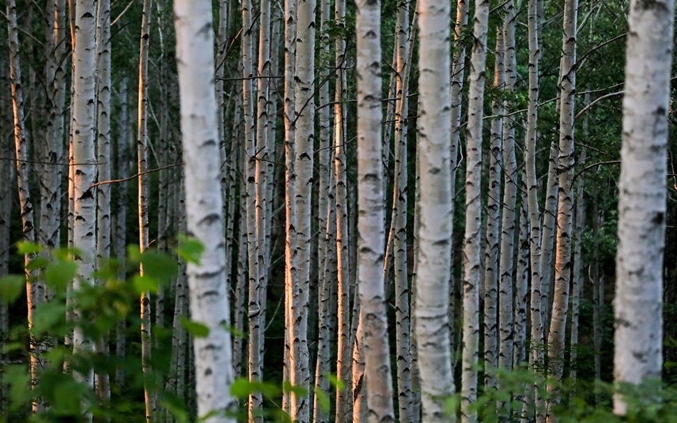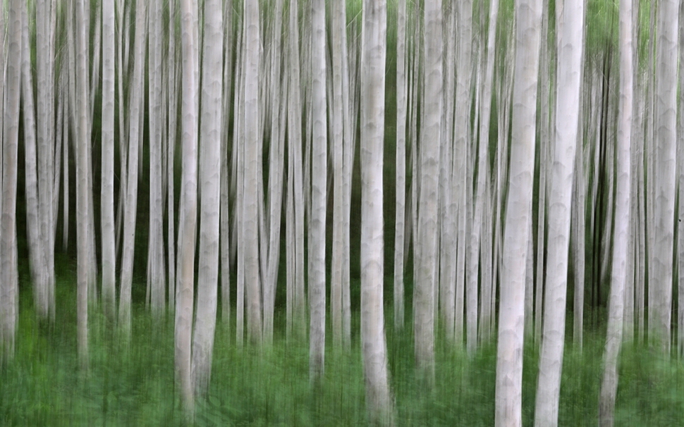 자작나무 숲은 한여름을 앞두고 하얀 줄기와 짙은 초록 잎이 한데 어우러진다. 오묘하게 수직으로 조화를 이룬 세상이다. 숲의 특징을 더 효과적으로 표현하려고 저속 셔터 카메라를 삼각대 위에 고정한 채 나무줄기를 따라 수직으로 움직여 찍었다.