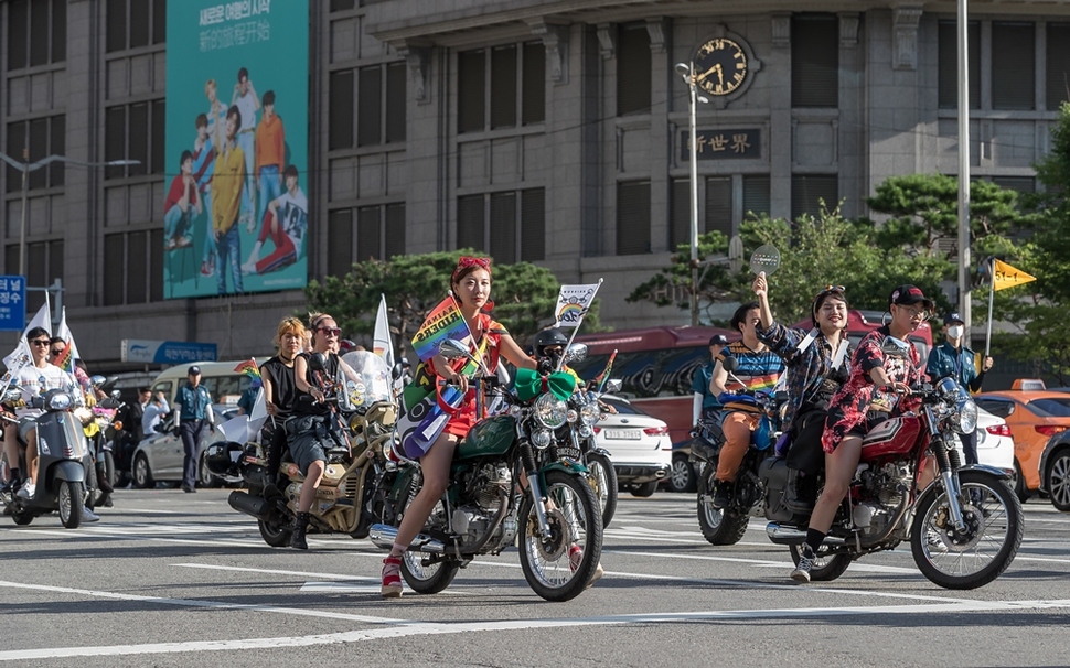 성소수자들의 축제인 서울퀴어문화축제가 열린 7월14일, 퀴어퍼레이드 선두에서 ‘레인보우 라이더스’라는 이름의 모터바이크 운전자들이 서울 명동 거리에서 행진을 이끌고 있다. 페미니스트 여성들의 자발적인 참여로 꾸려진 레인보우 라이더스는, 다양성을 뜻하는 무지개 깃발을 바이크에 단 채 거리를 누볐다. 19회를 맞는 올해 축제에는 연인원 12만 명(주최 쪽 추산)이 참여해 역대 최다 인원을 기록했다. 소수자 권리에 공감하는 시민이 늘어나고 있음을 보여준다. 이 사진은 사회적 소수자를 카메라에 담아온 박승화 기자가 찍었다.