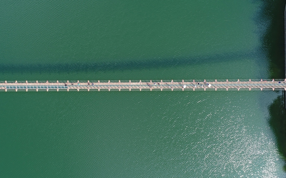 국내에서 가장 긴 경기도 파주 마장호수 흔들다리(길이 220m, 폭 1.5m)를 찾은 시민들이 마치 푸른 호수의 물 위를 걷듯 다리를 건너고 있다.
