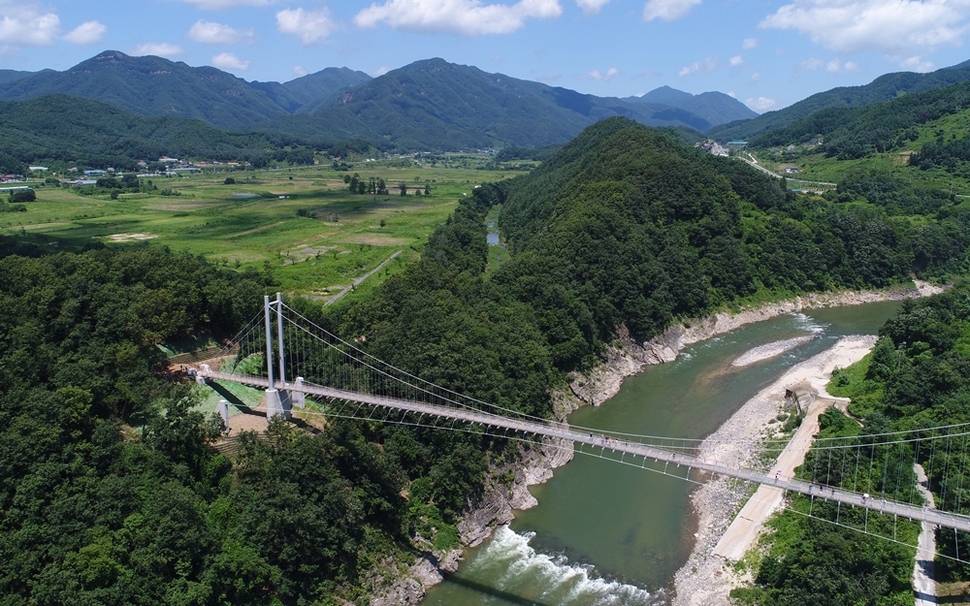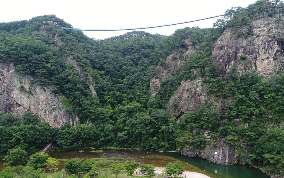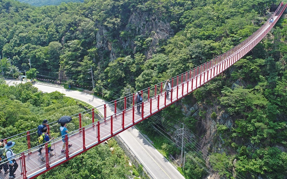 파주 설마천 계곡 45m 높이에 걸린 감악산 출렁다리. 다리 아래로 자동차가 다니는 도로, 계곡과 바위 절벽이 한데 어우러진다.