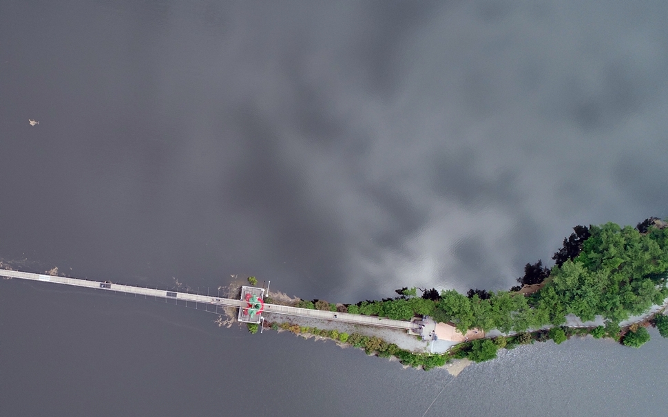충남 청양 칠갑산 아래 천장호에 설치된 출렁다리 주변 물 위로 하늘의 구름이 비친다.