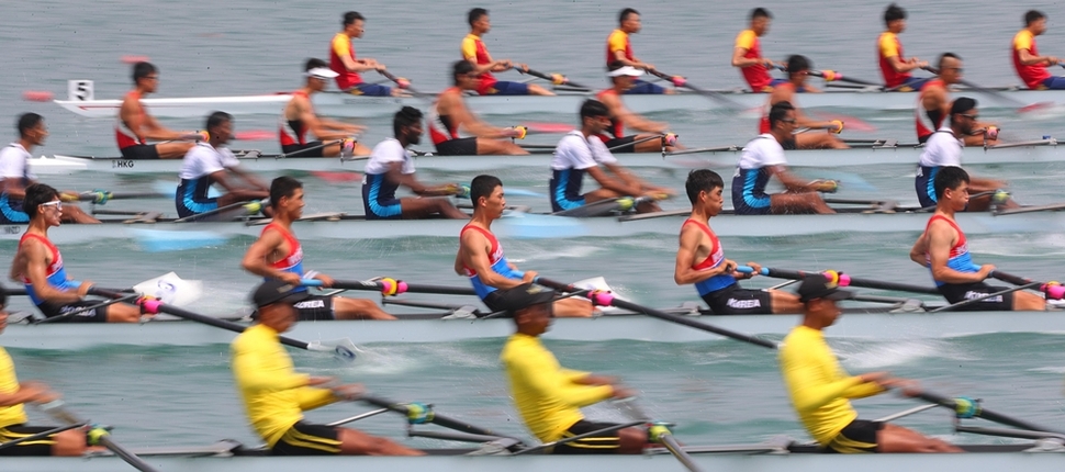 2018 자카르타-팔렘방 아시안게임에 출전한 남북 단일팀 조정 선수들(아래에서 둘째)이 8월22일 인도네시아 팔렘방 자카바링 스포츠시티 조정경기장에서 열린 남자 경량급 에이트 패자부활전에서 힘차게 노를 젓고 있다. 단일팀 선수들은 결승선을 3위로 통과해 결선에 진출했다. 24일 열린 결선 경기에서 단일팀은 5위에 그쳐 메달 획득에는 실패했다. 황우석 남쪽 조정 감독은 “아시아대회에서 우리가 이 정도까지 따라붙은 것은 처음”이라며 만족감을 보였고, 조정 단일팀 맏형인 북쪽 김철진(27) 선수는 “우리가 하나 되면 더 큰 하나가 된다는 것을 믿는다”고 말했다. 이정우 선임기자