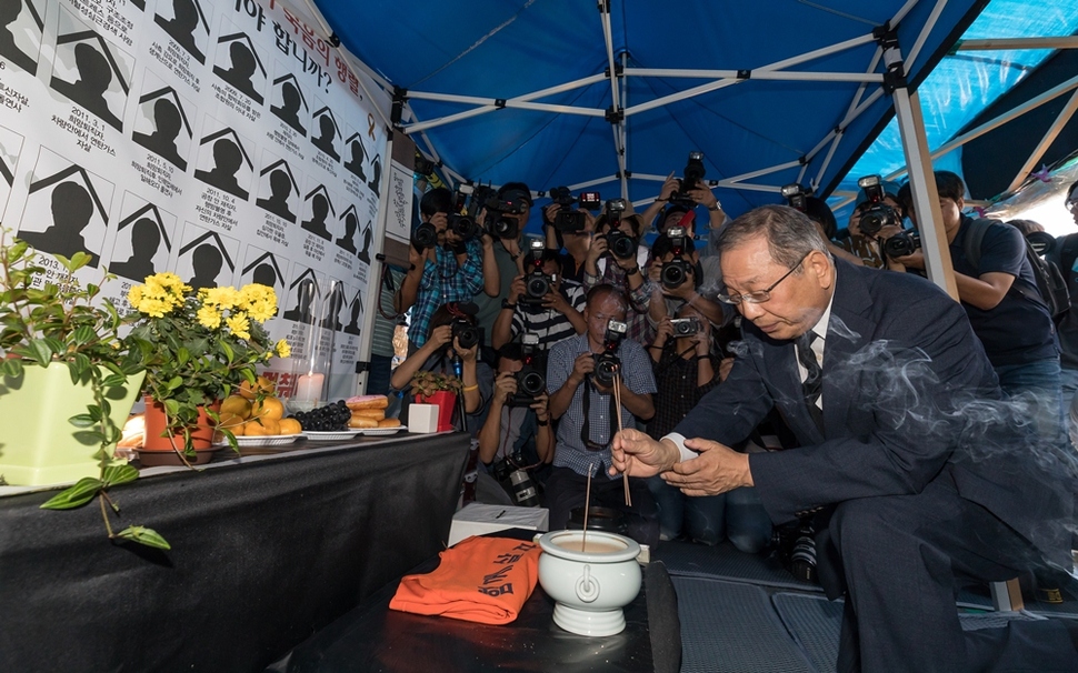 최종식 쌍용자동차 사장이 9월13일 오후 서울 세종대로 대한문 앞 쌍용차 희생자 분향소를 찾아 분향하고 있다. 이곳에는 2009년 회사의 구조조정에 맞서 농성을 벌이다 무자비하게 강제 진압된 뒤 희망퇴직이란 이름으로 일자리를 빼앗긴 이른바 ‘쌍용차 사태’ 관련 희생자 30명의 영정이 자리하고 있다. 최 사장은 조문 뒤 김득중 금속노조 쌍용차지부장과 해고자 복직을 위한 교섭을 재개했다. 해고 사태 뒤 회사 대표가 분향소를 찾은 건 처음인만큼, 더 이상의 희생을 멈출 전향적 합의가 이뤄지길 기대한다.