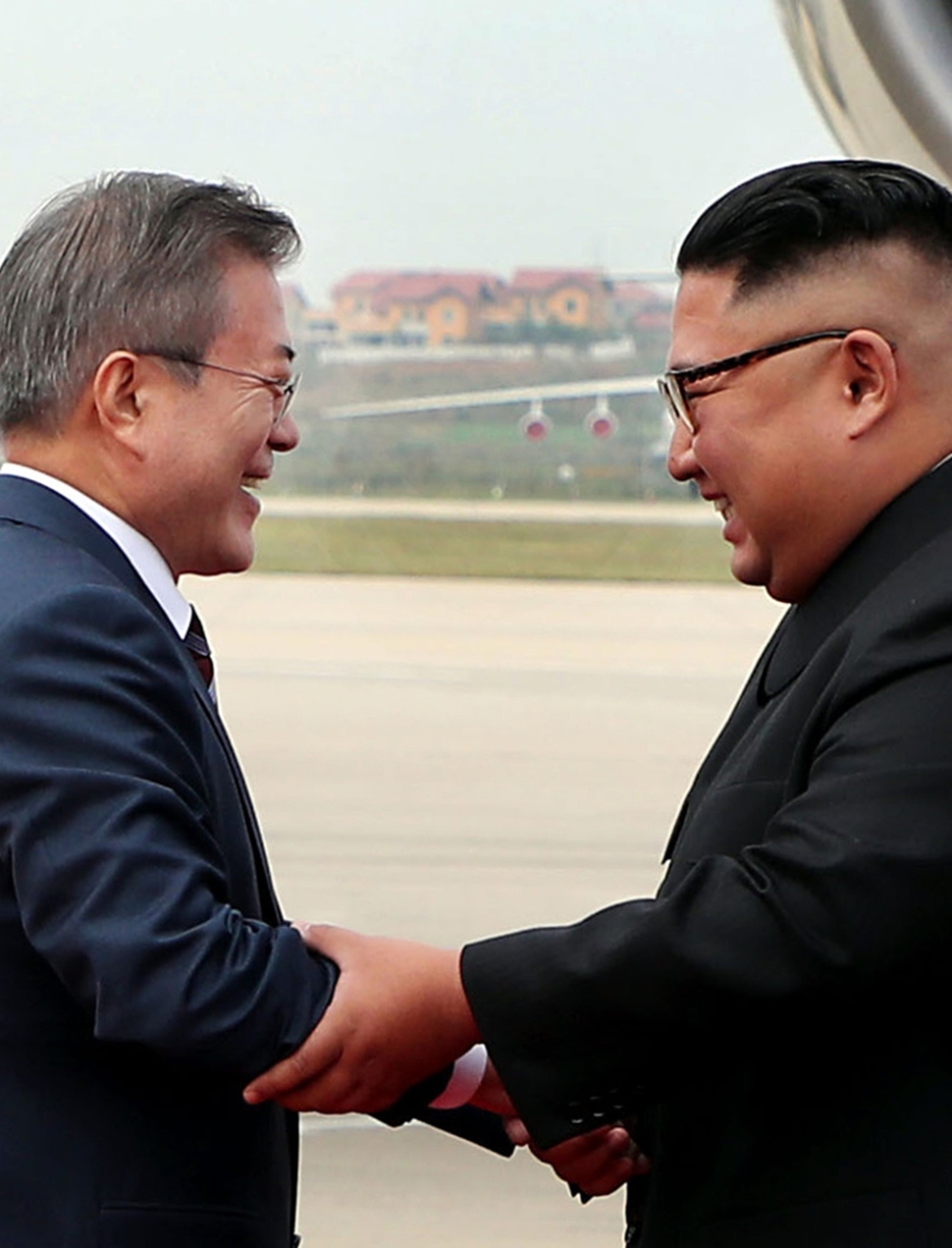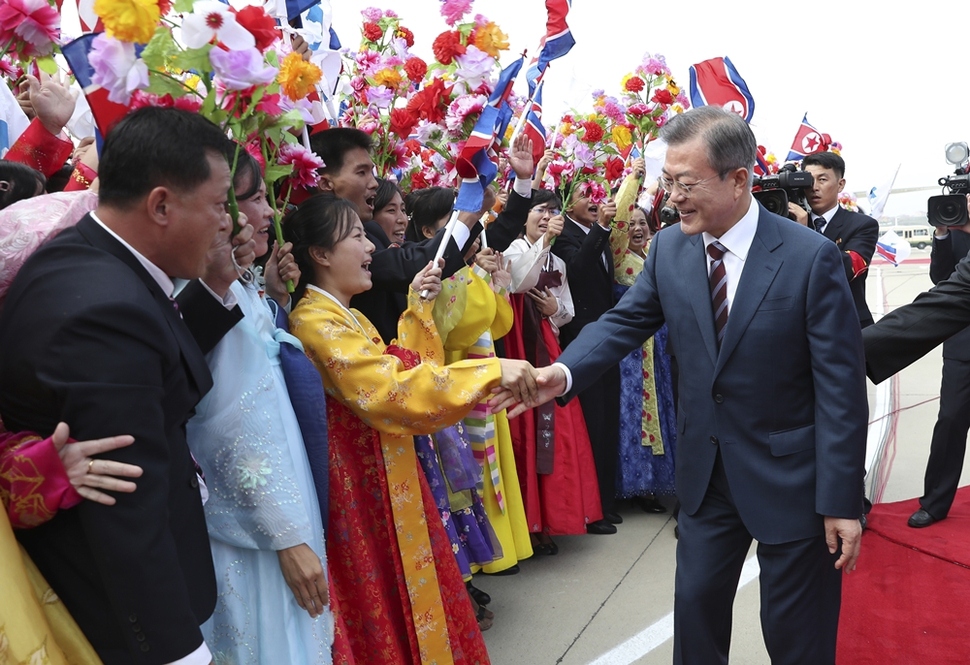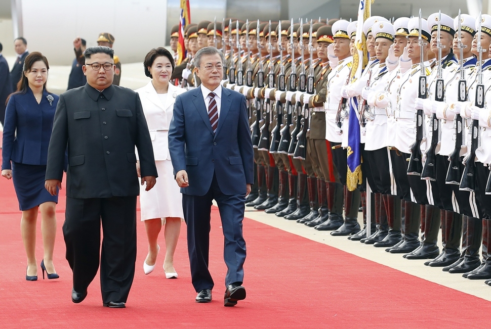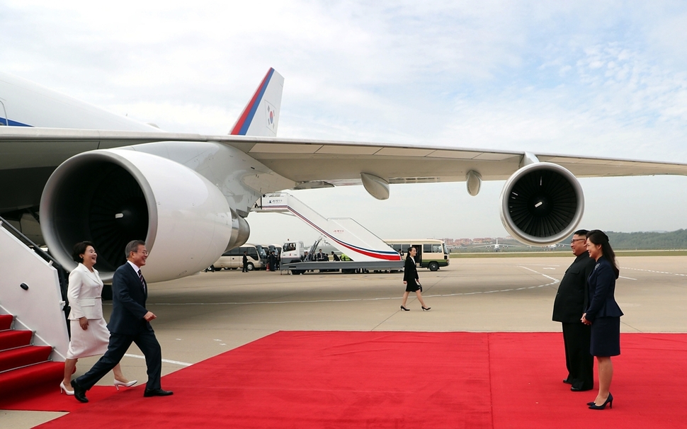 문재인 대통령과 김정숙 여사가 9월18일 오전 평양 순안공항에 도착해, 대한민국 공군 1호기 앞에 서서 기다리던 김정은 북한 국무위원장과 리설주 여사를 향해 걸어가고 있다. 올해 벌써 세 번째 만난 두 정상의 얼굴에 반가움의 웃음이 번지고 있다.