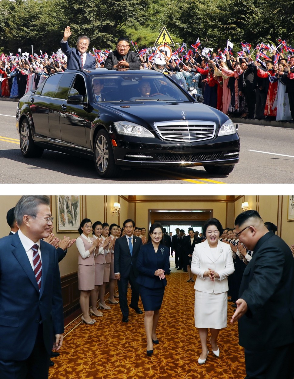 문재인 대통령과 김정은 국무위원장이 함께 무개차를 타고 “조국 통일”을 연호하는 평양 시민들에게 손을 흔들고 있다. (위)/ 김정은 국무위원장이 백화원 초대소에서 문재인 대통령 부부를 맞이하고 있다. (아래)