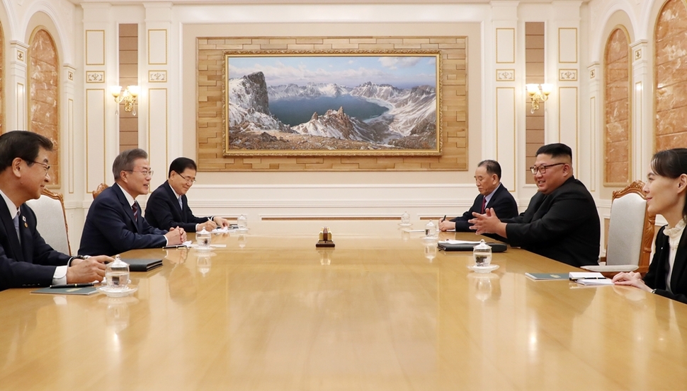 문재인 대통령과 김정은 국무위원장이 평양 조선노동당 중앙위원회 본부 청사에서 정상회담을 하고 있다. 앞줄 왼쪽부터 시계 방향으로 서훈 국가정보원장, 문 대통령, 정의용 국가안보실장, 김영철 당중앙위 부위원장, 김 국무위원장, 김여정 당중앙위 제1부부장.