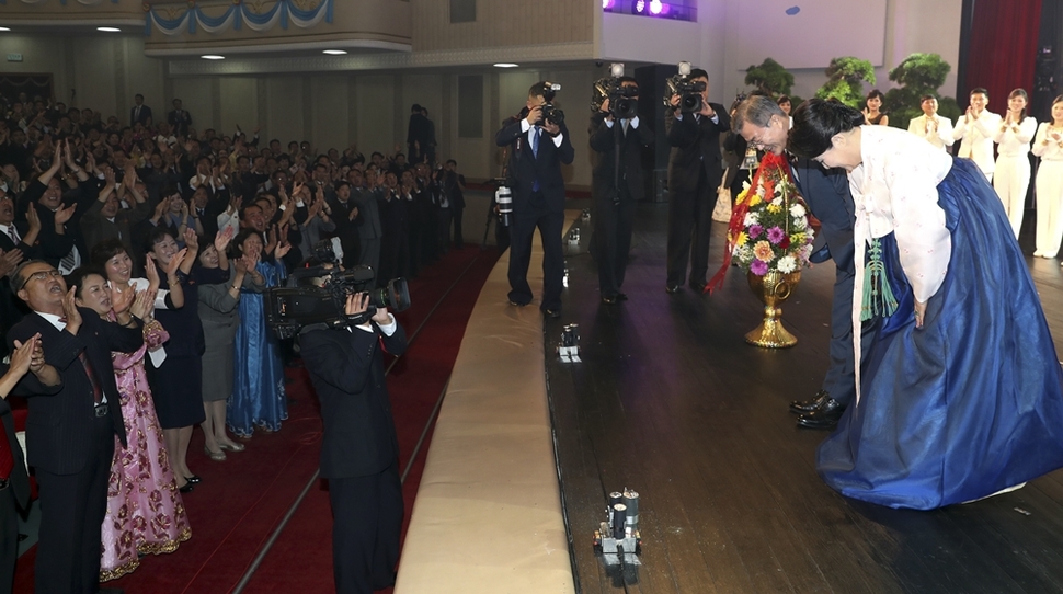 문재인 대통령과 김정숙 여사가 평양대극장에서 열린 삼지연 관현악단의 환영공연을 관람한 뒤 무대에 올라 평양 시민들에게 고개 숙여 인사하고 있다.