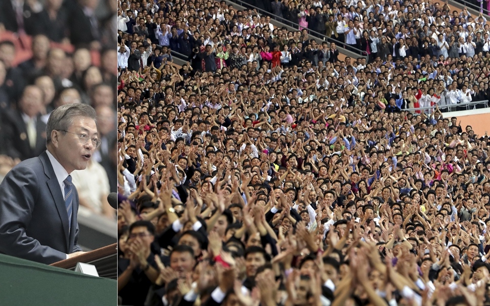 문재인 대통령이 9월19일 저녁 평양 능라도 5·1경기장에서 대집단체조와 예술공연 ‘빛나는 조국'을 관람한 뒤 평양 시민들에게 인사말을 하고 있다(왼쪽). 문재인 대통령이 연설하는 동안 능라도 5·1경기장을 가득 메운 평양 시민들이 기립 박수를 보내고 있다.