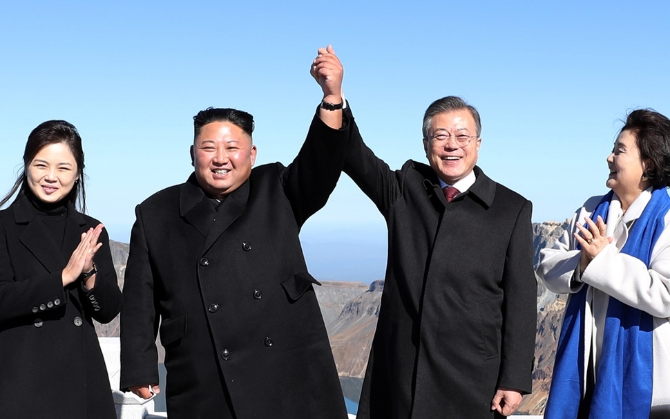 문재인 대통령과 김정은 국무위원장이 회담 마지막 날인 9월20일 오전 백두산 장군봉에 올라 두 손을 맞잡은 채 들어올리고 있다. 김정숙 여사와 리설주 여사가 박수 치고 있다.