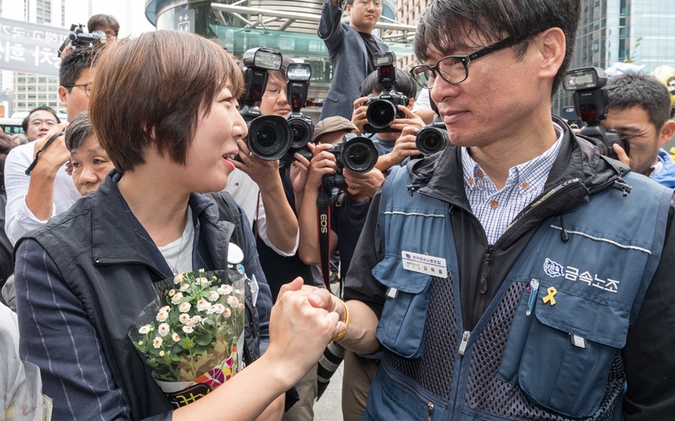 김득중 전국금속노조 쌍용자동차지부장(오른쪽)이 회사 쪽과 9년 만에 해고자 전원 복직에 합의한 뒤, 9월14일 오전 서울 중구 덕수궁 대한문 앞 분향소에서 김승하 철도노조 케이티엑스(KTX)열차승무지부장의 축하를 받고 있다. 김 지부장 등 2009년 회사에서 밀려난 119명의 쌍용차 해고자들은 올해와 내년 두 차례에 걸쳐 복직하기로 합의했다. 이보다 앞서 2006년 해고된 KTX 승무원들은 12년 동안 거리에서 살았다. 두 곳에서 해고된 노동자 가운데 적잖은 이가 목숨까지 잃었다. 먼저 복직이 결정된 김승하 지부장은 “그동안 우리는 쌍용차 동지들을 생각하면 웃을 수가 없었습니다. 이제 우리도 복직의 기쁨을 누리고 표현할 수 있게 됐습니다”라며 웃음 띤 축하를 건넸다.
