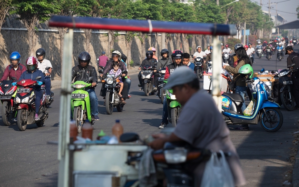 이른 아침 오토바이를 타고 출근하는 인도네시아 콜트(PT CORT) 노동자들.