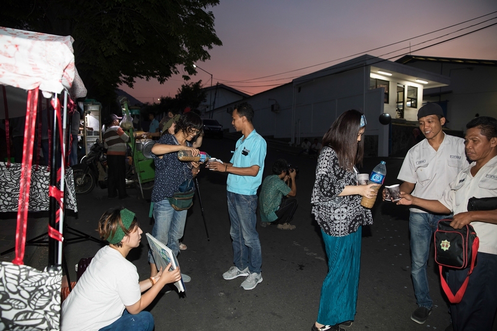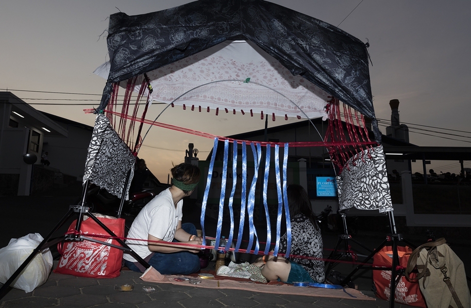 처음 며칠은 인도네시아 노동자들의 하루를 조심스럽게 지켜보며 소극적이지만 친밀감을 높이기 위한 시간을 보냈다. 낯선 우리에게 환한 웃음으로 답하는 그들에게서 용기를 얻어 본격적인 작업에 매진할 수 있었다. 공장 맞은쪽에 ‘일시적 장소’를 열어 그림을 그리고, 시를 읽고, 기록했다. 회사가 분진과 유기용제 사용이 많은 공정에도 면 마스크만 주는 데 착안해, 노동 착취의 상징이자 노동자 권리를 의미하는 글자가 새겨진 방진 마스크를 나누었다. 생활의 불편에 개입하는 것만으로도 공감을 불러일으키는 과정이었다. 이 기록은 인간 존엄에 관한 문장들로 재배치돼 ‘자기 몫’을 찾은 주체로서 노동자들을 재현할 것이다.