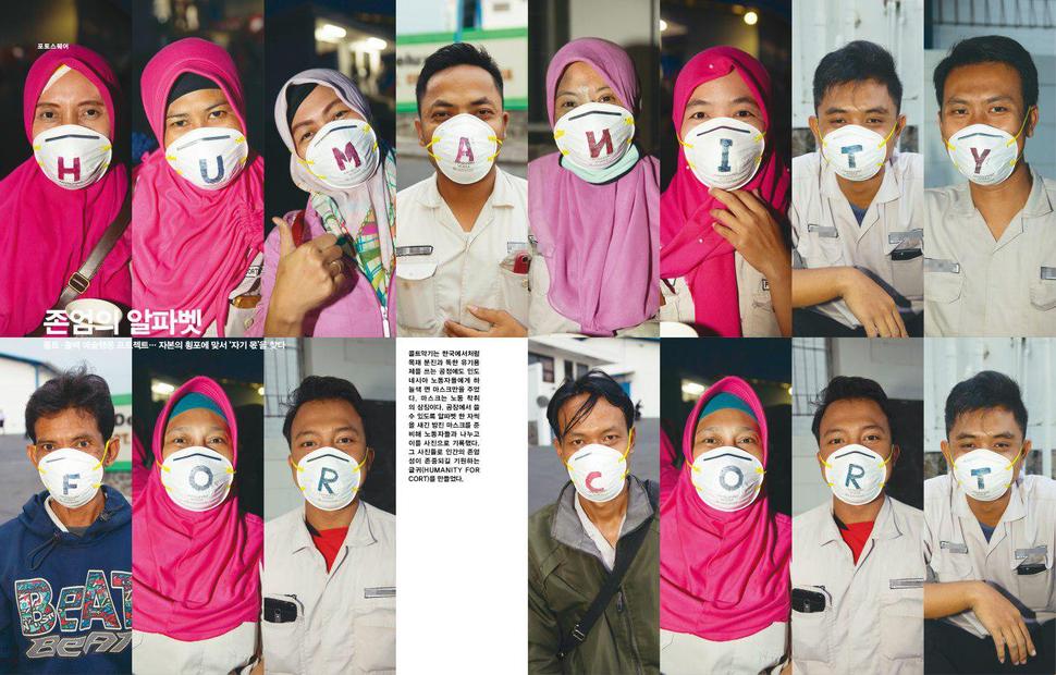 콜트악기는 한국에서처럼 목재 분진과 독한 유기용제를 쓰는 공정에도 인도네시아 노동자들에게 하늘색 면 마스크만을 주었다. 마스크는 노동 착취의 상징이다. 공장에서 쓸 수 있도록 알파벳 한 자씩을 새긴 방진 마스크를 준비해 노동자들과 나누고 이를 사진으로 기록했다. 그 사진들로 인간의 존엄성이 존중되길 기원하는 글귀(HUMANITY FOR CORT)를 만들었다.