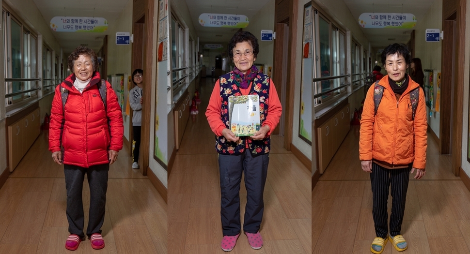 강원도 평창군 방림초등학교 1학년 국어 시간. 1학년 전체 학생은 다섯 명. 올해 7살인 차예서와 김형우 어린이, 뒷줄에 앉은 할머니들이 한목소리로 노래 부르고 율동을 한다. 방림5리에 사는 전일옥(78), 박고이(73), 박경순(65) 할머니다. 세 할머니는 학교버스를 타고 등교한다. 학교에 오면 먼저 60~70년 차이 나는 동급생들과 함께 건강달리기를 한다. 쉬는 시간에는 좋아하는 동화책을 읽기도 한다. 수업 시간에는 글을 배우고 노래를 부르고 ‘석고 방향제’도 만들어본다.