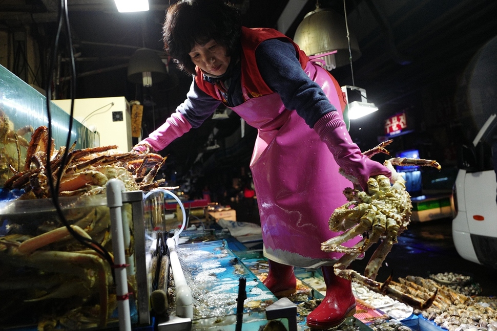 한 상인이 11월7일 수협의 단전으로 폐사 위기에 처한 대게를 급히 옮기고 있다.