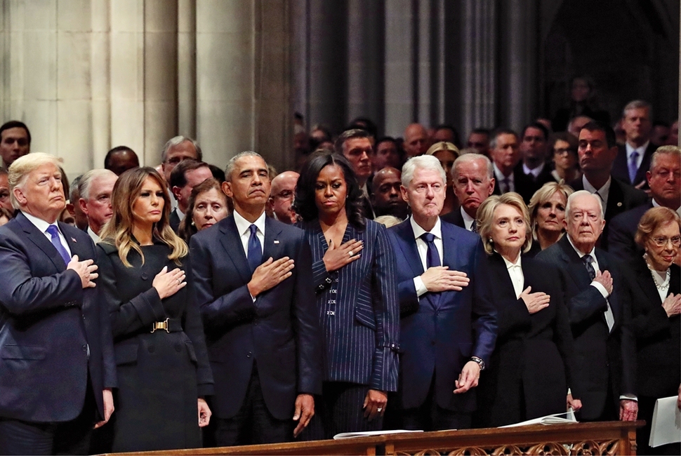 미국 제41대 대통령 조지 허버트 워커 부시(94)의 장례식이 열린 12월5일(현지시각), 워싱턴 대성당에서 도널드 트럼프 대통령 부부와 역대 대통령들이 고인의 운구 행렬을 지켜보고 있다. 앞줄 왼쪽부터 제45대 대통령 도널드 트럼프와 부인 멜라니아 트럼프, 제44대 대통령 버락 오바마와 부인 미셸 오바마, 제42대 대통령 빌 클린턴과 부인 힐러리 클린턴, 제39대 대통령 지미 카터와 부인 로절린 카터. 제43대 조지 W. 부시 대통령은 아버지의 운구를 따르고 있어 사진에 보이지 않는다. 트럼프 대통령은 이 자리에서 오바마 전 대통령 부부에게 인사를 건넸으나, 클린턴 전 대통령 부부와는 인사를 나누지 않았다. 냉랭하고 경직된 이들의 표정에서 저마다의 관계가 읽히는 듯하다.